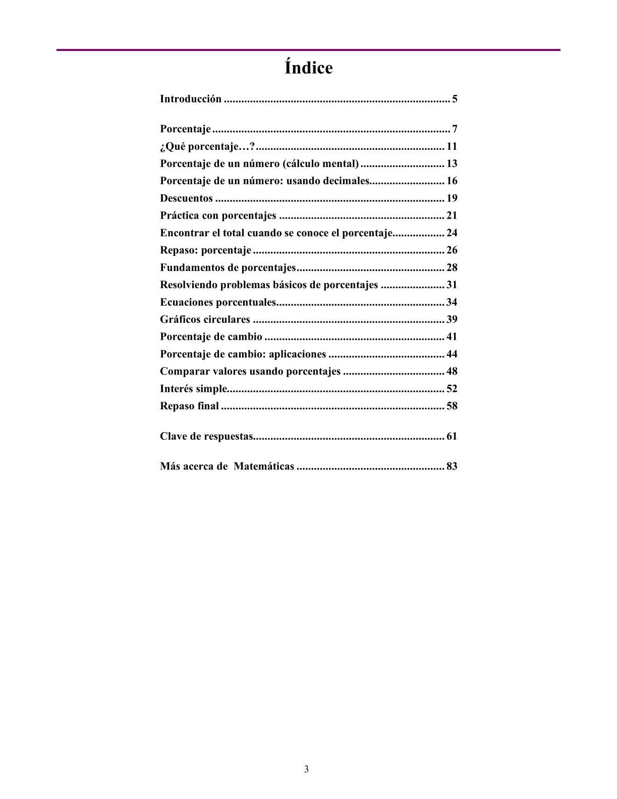 Matemáticas Porcentaje es un libro autodidacto que enseña a los estudiantes a comprender el concepto de porcentaje, a calcular el porcentaje de un número, a determinar descuentos e impuestos, a dibujar gráficos circulares, a diferenciar entre un porcentaje de cambio y un porcentaje de comparación y a saber calcular ambos. El libro es apto para alumnos de 6° a 2° grado de “escuela secundaria”.