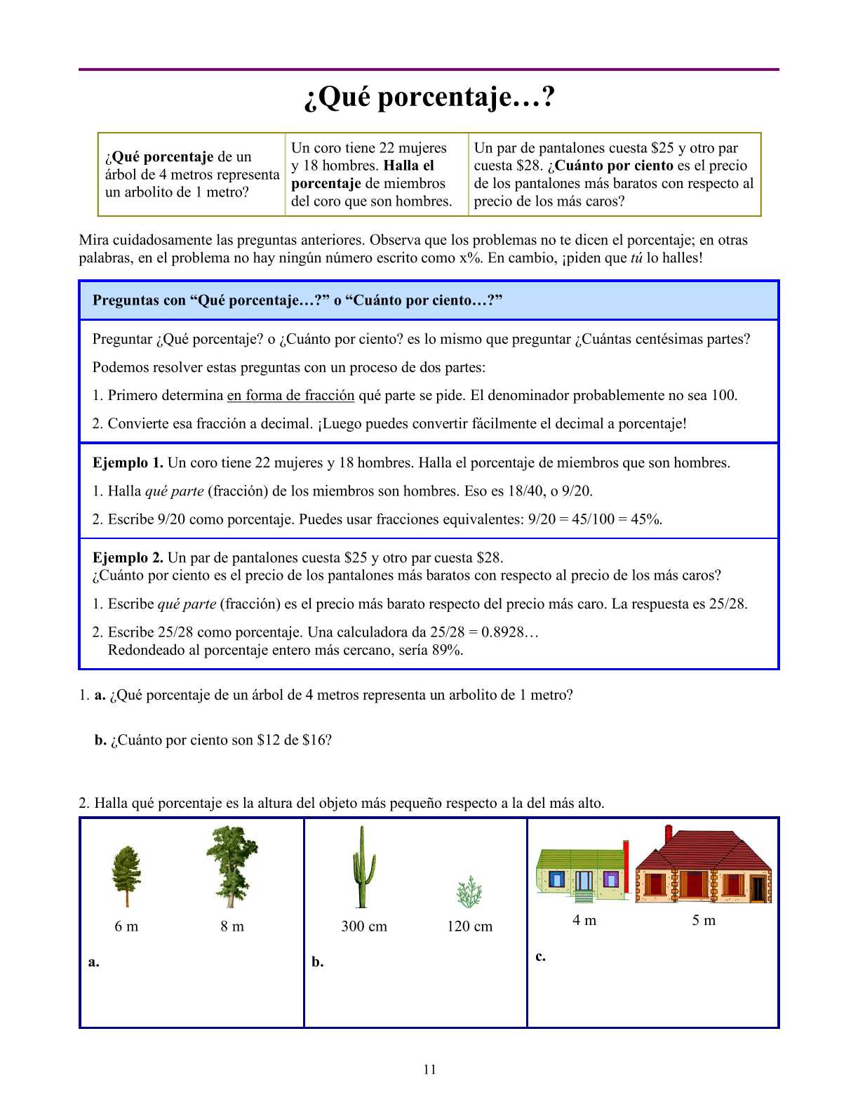 La primera lección, Porcentaje, muestra el concepto de porcentaje como una centésima parte y cómo escribirlo como fracción y decimal. Posteriormente, estudiamos cómo encontrar un porcentaje teniendo la parte y el entero (por ejemplo, si 15 de 25 miembros de un club son niñas, ¿qué porcentaje del club son niñas?).