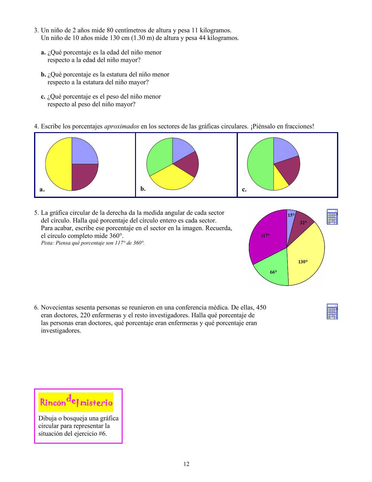 A continuación, hay una lección sobre descuentos, una aplicación importante en la vida cotidiana. Seguimos con Práctica con porcentajes, una lección que contrasta los dos tipos de problemas que los alumnos han estudiado hasta ahora: calcular el porcentaje de un número (dado el porcentaje) y determinar qué porcentaje representa una cantidad. Por ejemplo, el primer tipo de pregunta podría ser “¿Cuánto es el 70% de $380?”, y el segundo tipo sería “¿Qué porcentaje son $70 de $380?”