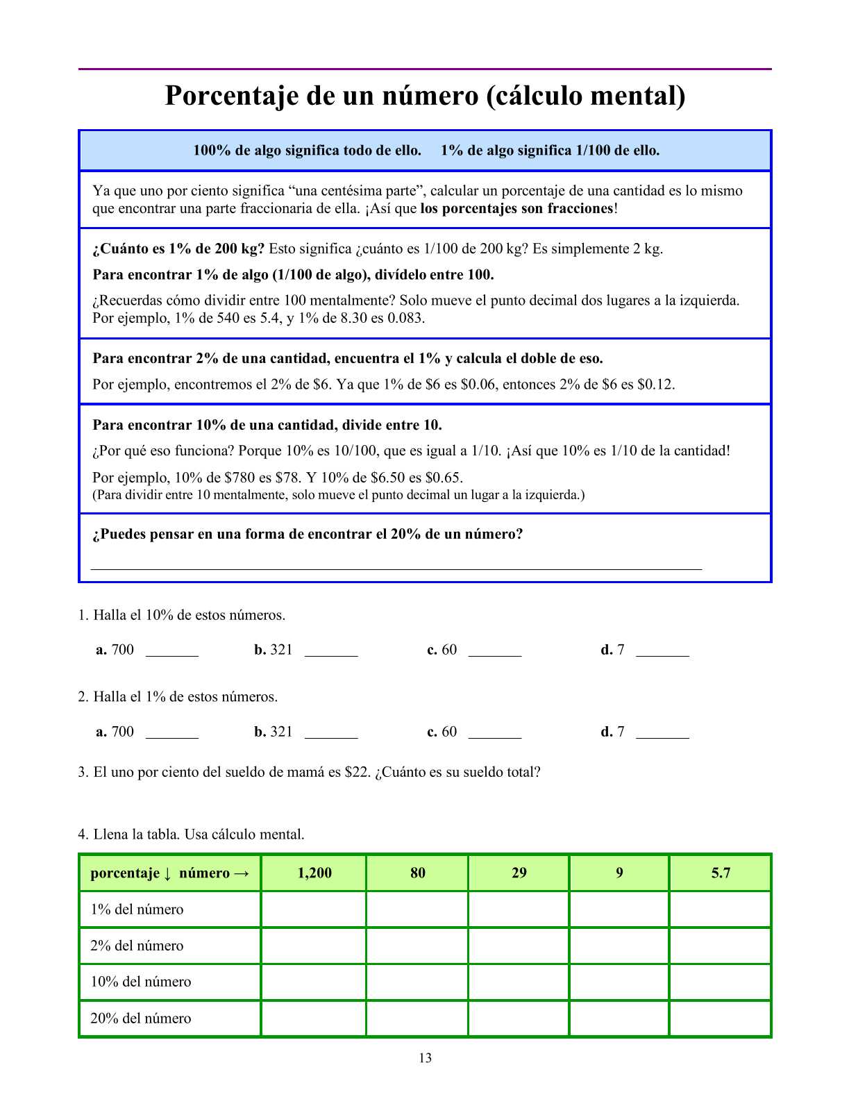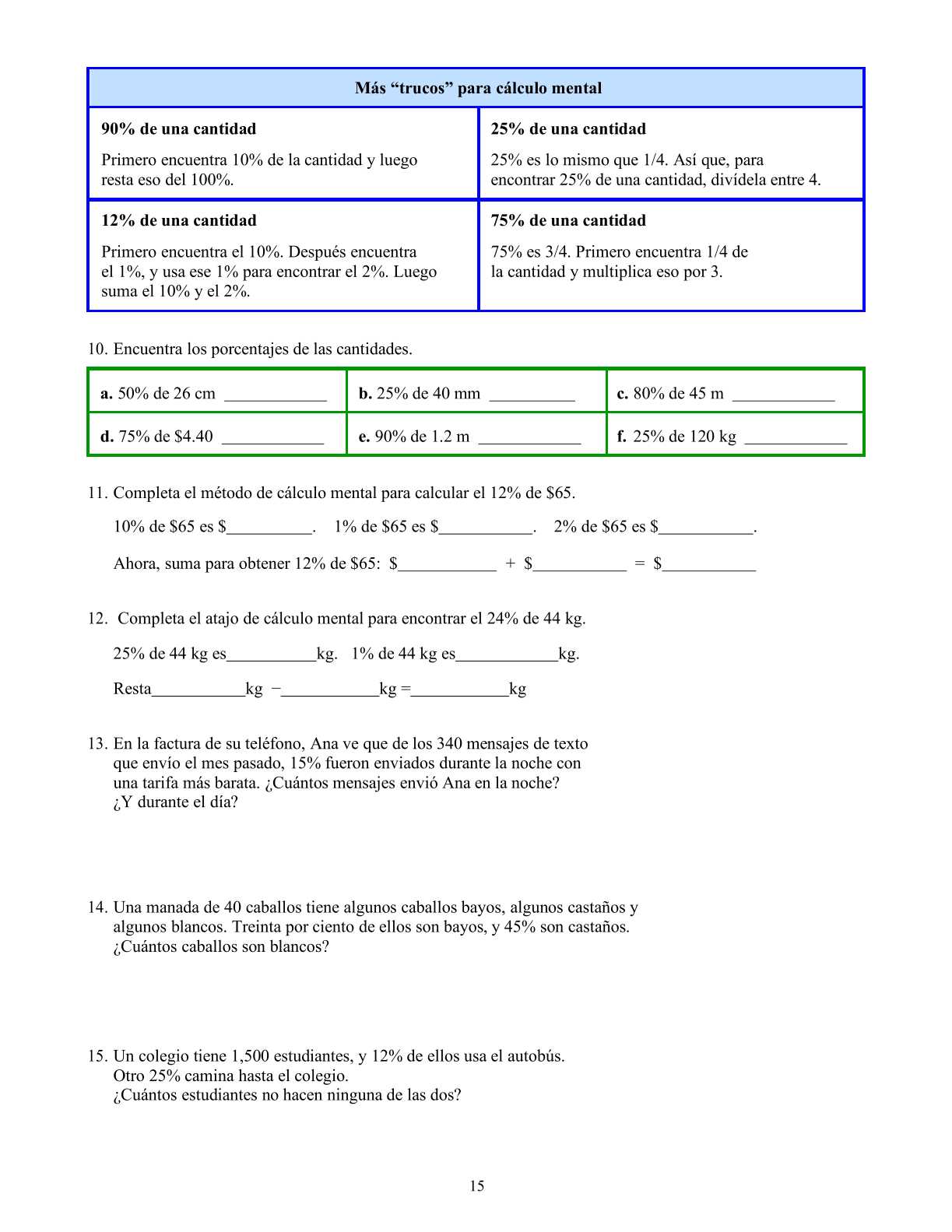 Las dos lecciones siguientes abordan el tema de encontrar el porcentaje de cierto número o cantidad. Primero, estudiamos cómo hacerlo mediante técnicas de cálculo mental. Por ejemplo, los alumnos encuentran 10% de $400 dividiendo $400 entre 10. Después, los estudiantes encuentran el porcentaje de una cantidad usando multiplicación decimal, con ayuda de una calculadora. Por ejemplo, los alumnos encuentran 17% de 45 km multiplicando 0.17 × 45 km.